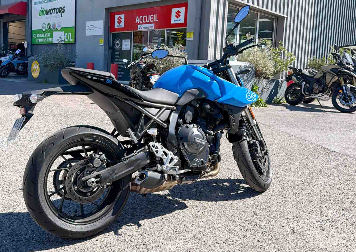 Convenient and clear booking system. Very quick to pick up and return the motorcycle on site, welcoming Suzuki dealership. The GSX 8S is in very good condition and well equipped (in terms of aesthetics and shifter up). Even with the restrictor, it's powerful enough to ride with a passenger through the mountain passes to the sea and in the Verdon, good engine, easy to handle. Only 2,200 km on the odometer at the time of rental. It's better to ride it alone than with a passenger, otherwise beware of the comfort of the passenger (seat and back) and even the driver, who ends up putting a lot of strain on their wrists.